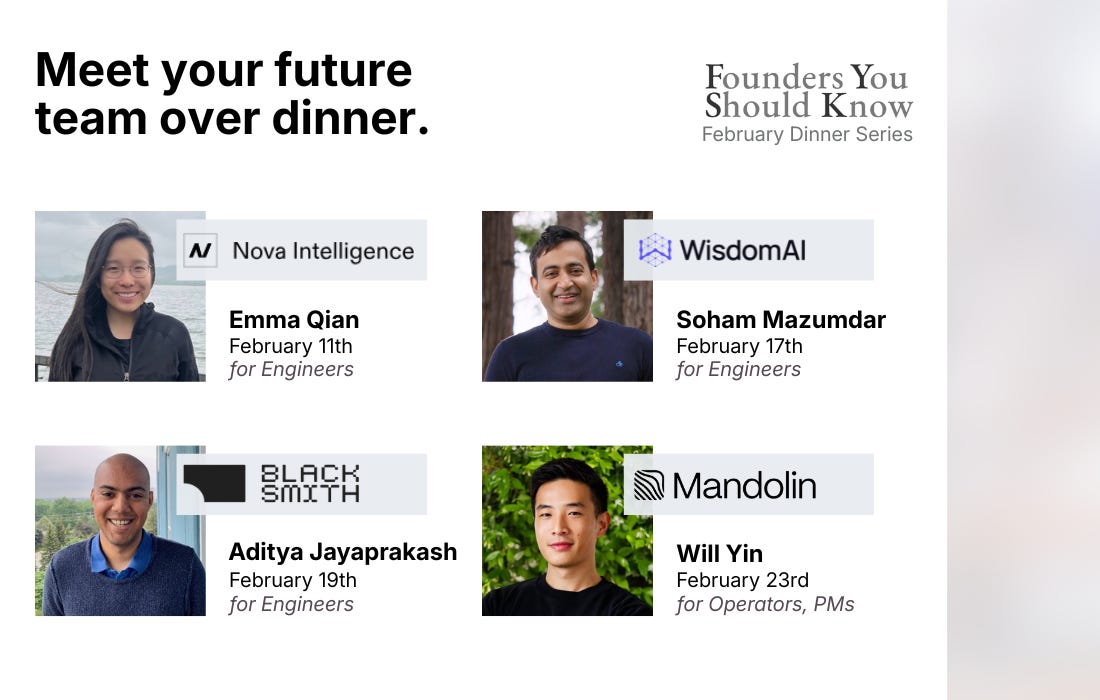 This February, we’re bringing back our private dinner series in San Francisco: intimate, off-the-record dinners where a small group of high-intent engineers and operators sit down with founders of inflecting companies to talk candidly about the real stories behind the build. These dinners are: