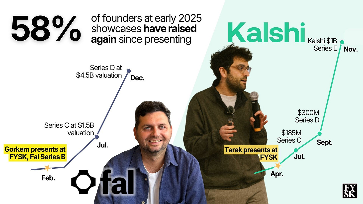 58% of founders who presented at our early 2025 showcases have already raised a subsequent round. A few have 10x’d their valuation since presenting.