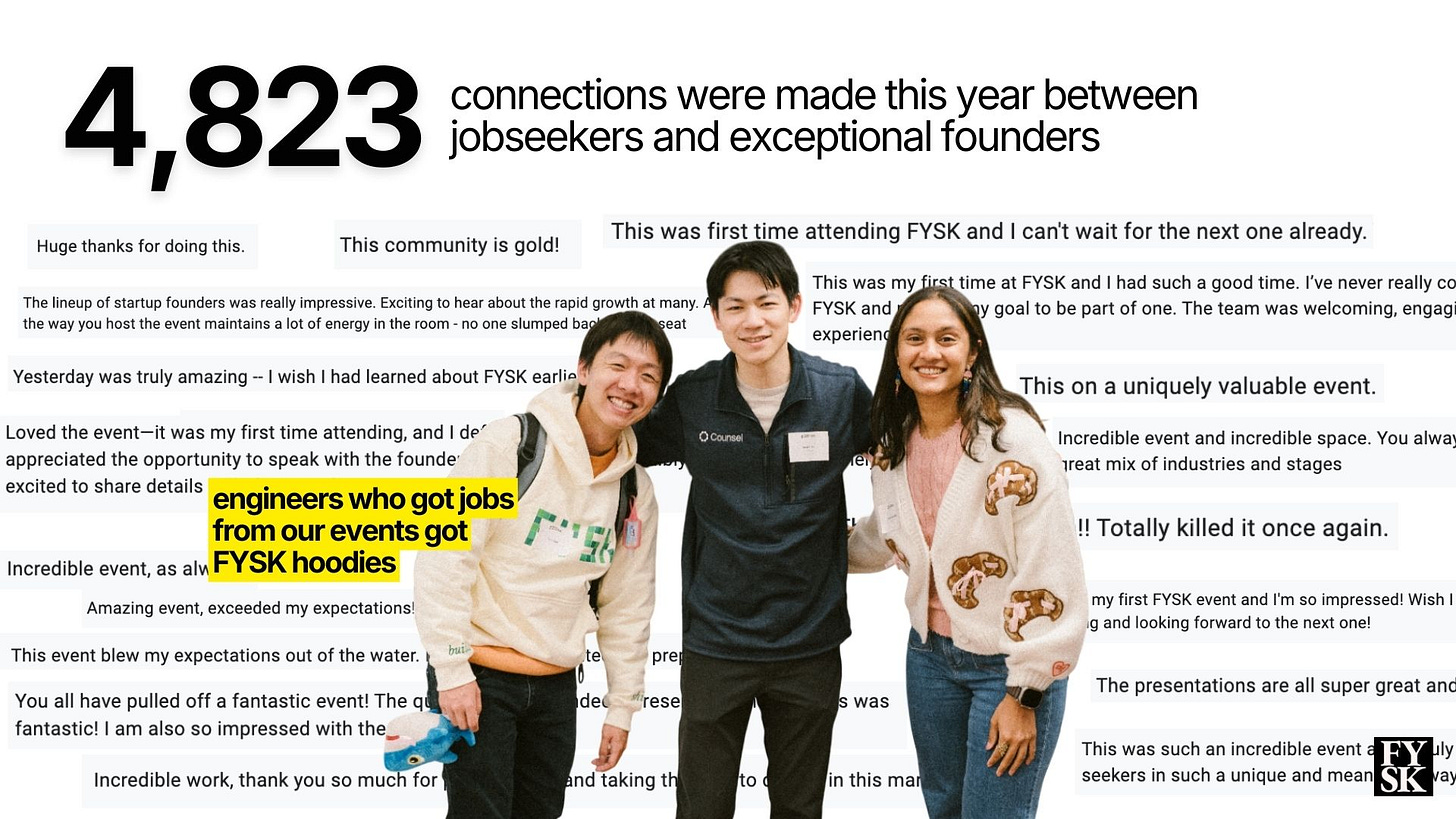 2025 was a year of compounding returns—for founders, for early believers, and for jobseekers who showed up to FYSK events in person. Here’s our year in review.